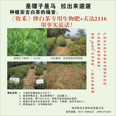 点击放大产品名称:安吉白茶示范 看得见的效果公司名称:杭州牧禾生物科技有限公司产品型号:008产品简介:国家“863”科技成果牧禾+2116:抗冻效果非常突出,具有抗旱、抗衰老(茶树年轻化)、能活化土壤、培肥地力、产量大幅度提高、降低病虫害(减少农药喷施量50%),大面积采摘提前5天以上,发芽多、出芽整齐等特点。